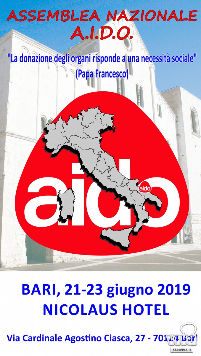 Si svolgerà dal 21 al 23 giugno 2019, nella sala convegni del Nicolaus Hotel di Bari, in via Cardinale Agostino Ciasca 27, l'assemblea nazionale AIDO - Associazione Italiana per la Donazione di Organi, Tessuti e Cellule.