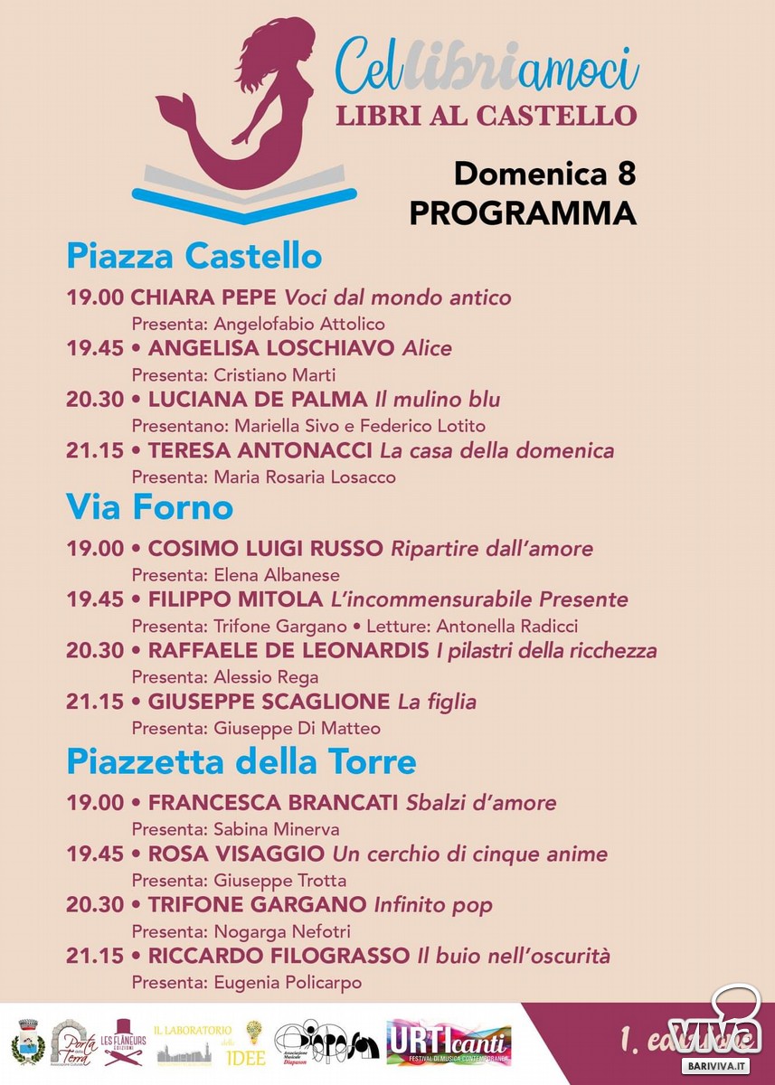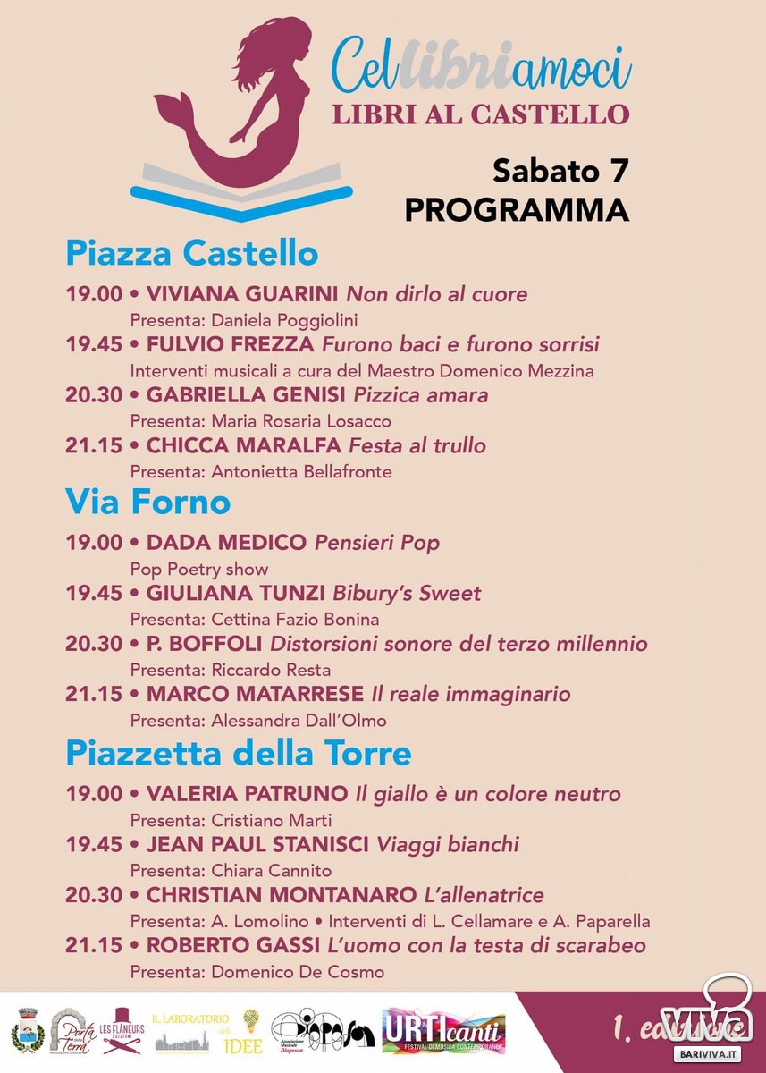 Si terrà sabato 7 e domenica 8 settembre la prima edizione del festival letterario Cellibriamoci, patrocinato dal Comune di Cellamare e che vedrà presentazioni di libri e discussioni con gli autori nei luoghi più caratteristici del centro storico di Cellamare. Di seguito il programma delle due giornate: