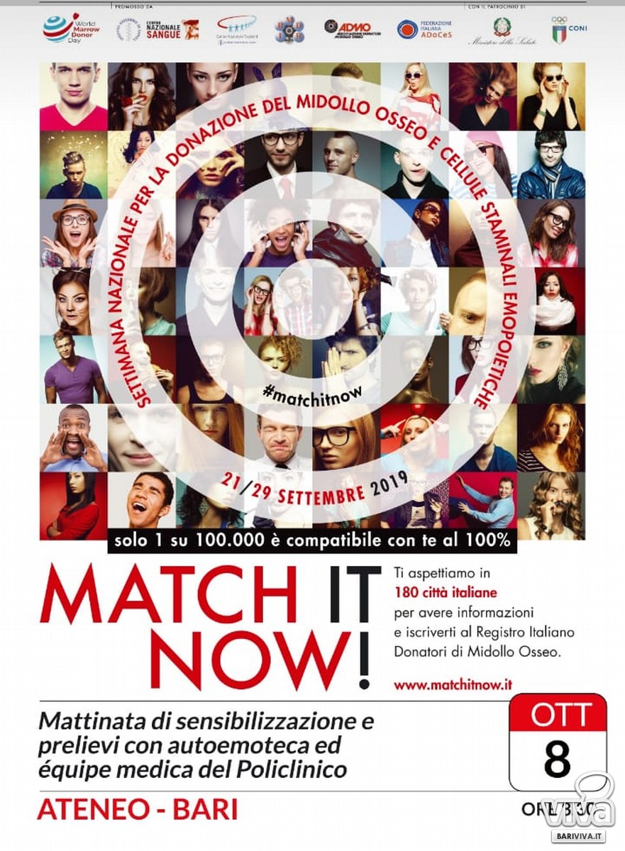 C'è anche Bari fra le 180 italiane che martedì 8 ottobre parteciperà alla giornata di sensibilizzazione sulla donazione del midollo osseo e delle cellule staminali. Appuntamento nell'atrio del palazzo Ateneo di Bari, a partire dalle 8:30, con i volontari di Admo che offriranno informazioni e la possibilità di iscriversi al registro dei donatori di midollo osseo. Sarà presente anche un'autoemoteca con equipe medica del Policlinico.
