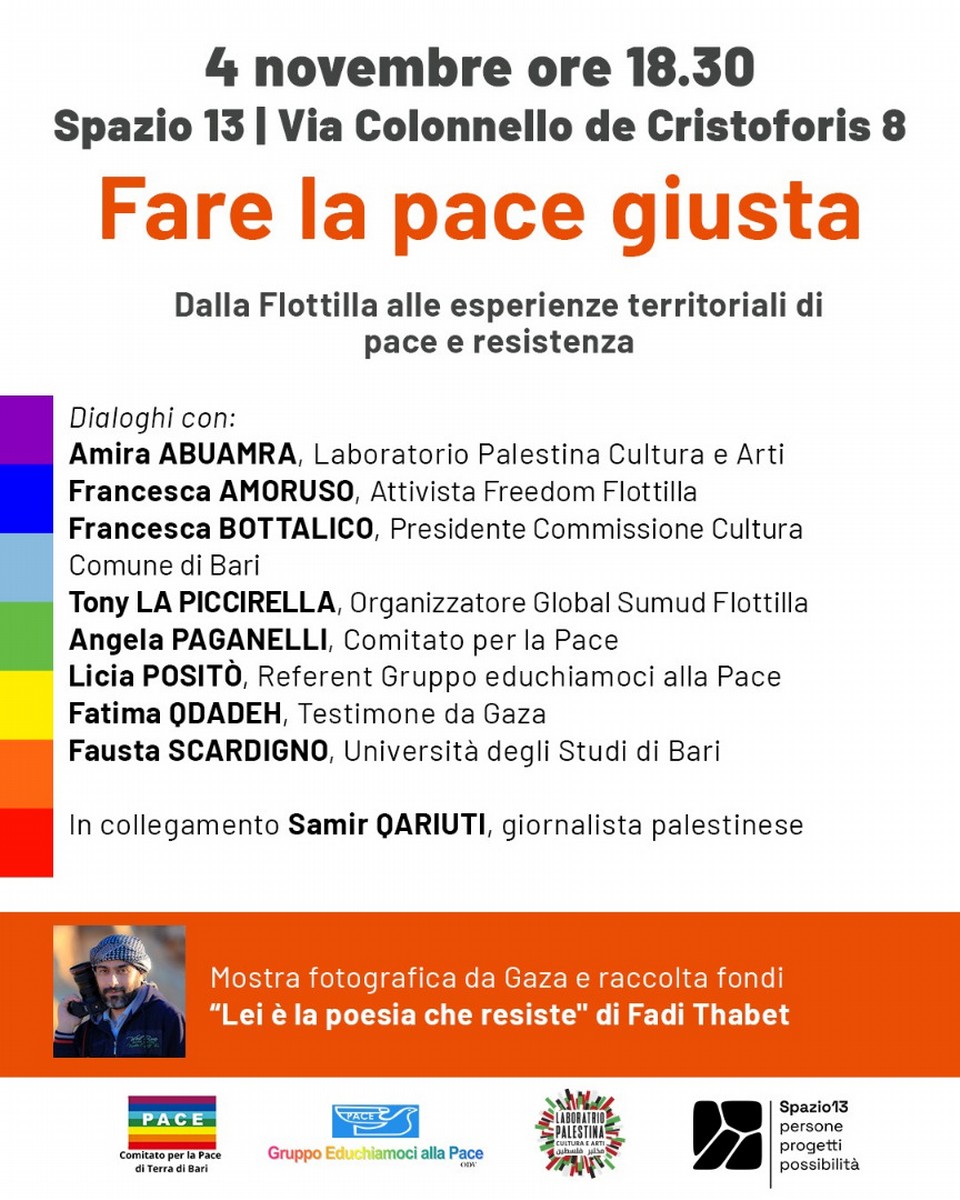 A Spazio 13 di Bari l'incontro “Fare la pace giusta”: dalla Flotilla alle esperienze territoriali di pace e resistenza