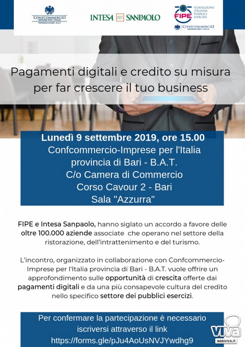 Intesa Sanpaolo e FIPE-Confcommercio (Federazione Italiana Pubblici Esercizi) hanno siglato lo scorso gennaio un accordo a favore delle aziende associate alla Federazione che operano nel settore della ristorazione, o e del turismo. Il 9 settembre a partire dalle ore 15 nella Sala Azzurra della Camera di Commercio di Bari si terrà una delle tappe del roadshow Fipe – Banca Intesa, con l'obiettivo di migliorare la cultura finanziaria delle imprese associate e di facilitare la relazione tra aziende e banca. All'incontro parteciperanno Alessandro Ambrosi, Presidente di Confcommercio Bari – BAT, Roberto Calugi, Direttore Genera-le FIPE, Luciano Sbraga, Responsabile Ufficio Studi FIPE, Marcello Paoli, Responsabile aziende retail Intesa Sanpaolo, Cinzia Bruzzone, Responsabile servizio retail Intesa San Paolo.
