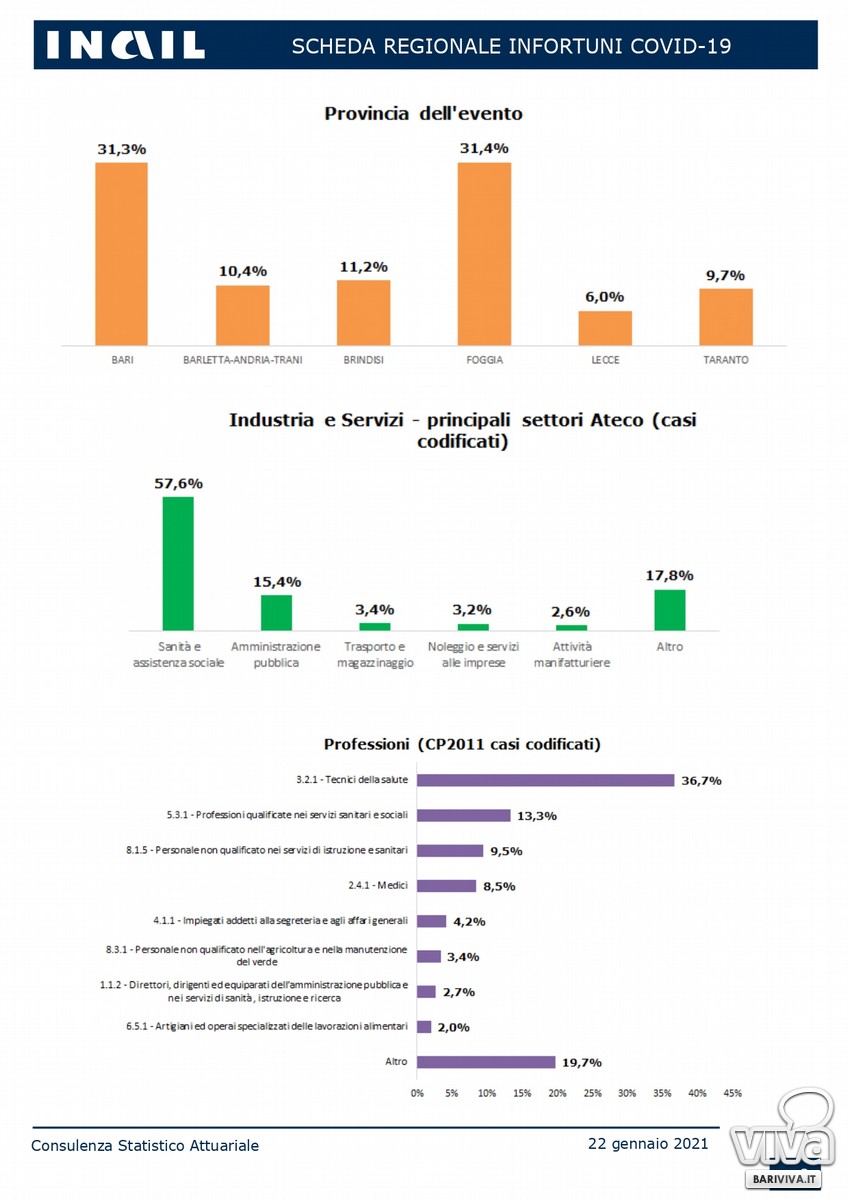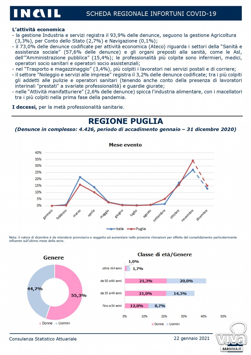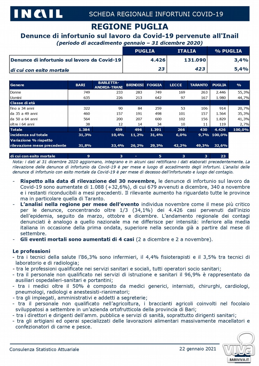 In Puglia, dall'1 gennaio 2020 al 31 dicembre 2020 sono stati 4.426 le denunce di contagio Covid sul luogo di lavoro. La provincia di Bari, insieme a quella di Foggia, sono maglia nera in questa particolare classifica. Sono 1.384, infatti, i contagi in provincia di Bari, pari ad un 31,3% del totale regionale (la provincia di Foggia ne conta 1.391 pari al 31,4%).