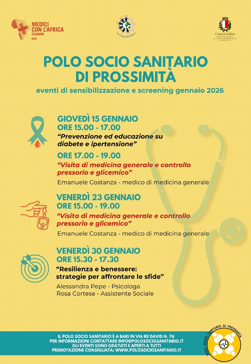 Continuano anche a gennaio gli incontri di sensibilizzazione e screening gratuiti negli spazi del Polo Socio Sanitario di Prossimità, in via Re David 76. Gli appuntamenti sono promossi dal Polo e organizzati da Psicologi per i Popoli Bari e Bat e Medici con l'Africa Cuamm Bari, in collaborazione con l'assessorato comunale al Welfare.