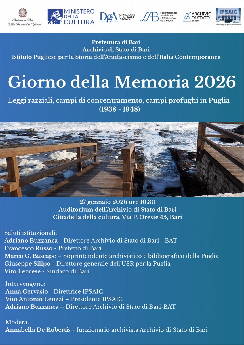 In occasione del Giorno della Memoria 2026, la Prefettura di Bari, l'Archivio di Stato di Bari e l'Istituto Pugliese per la Storia dell'Antifascismo e dell'Italia Contemporanea (IPSAIC) promuovono un incontro di studio e approfondimento dedicato a una delle pagine più drammatiche della storia italiana ed europea.