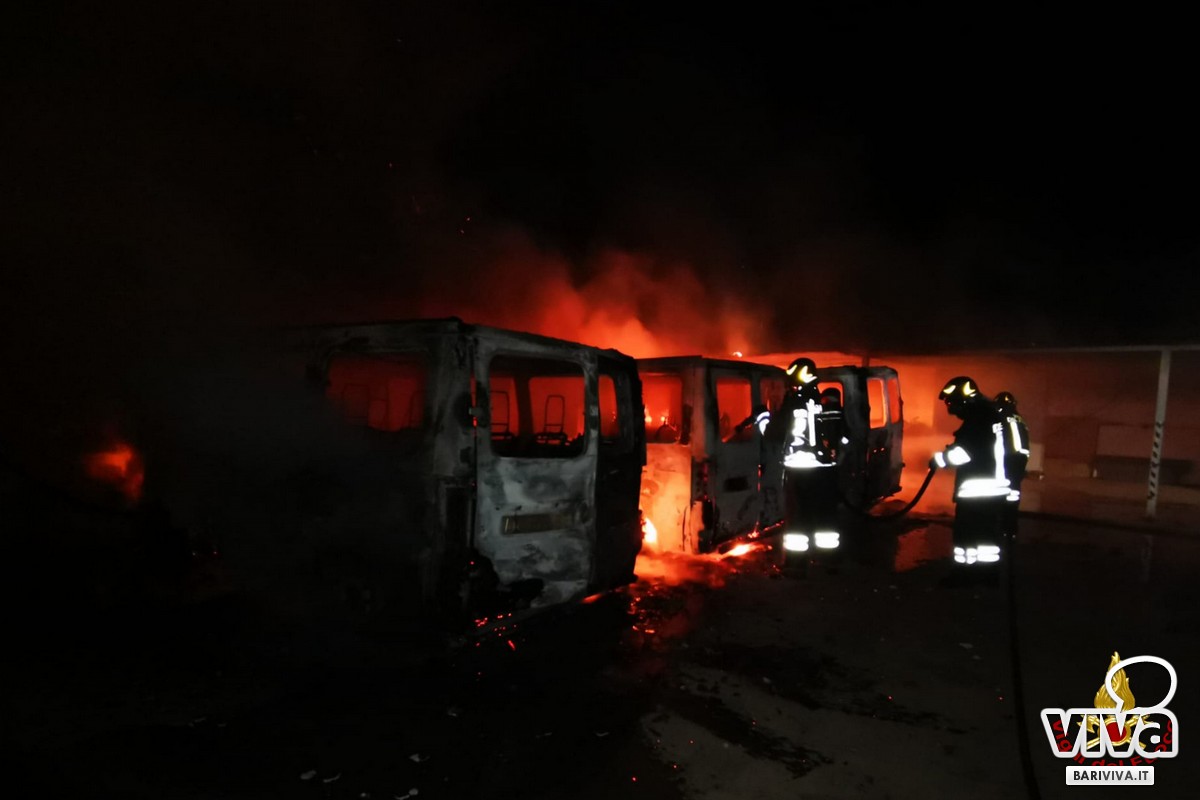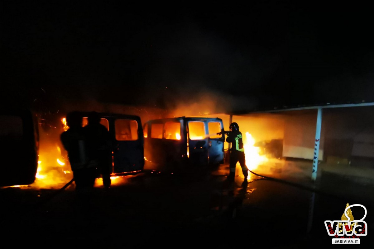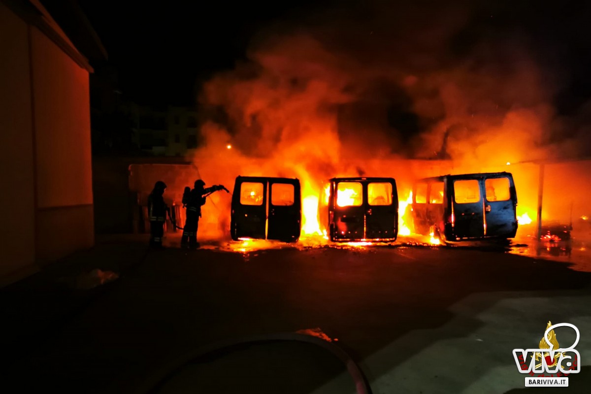 Rogo in un'azienda a Casamassima, dove nella notte sono intervenuti i Vigili del Fuoco: squadra in azione poco dopo mezzanotte, in un'azienda all'esterno tre veicoli furgonati in sosta erano avvolti dalla fiamme.