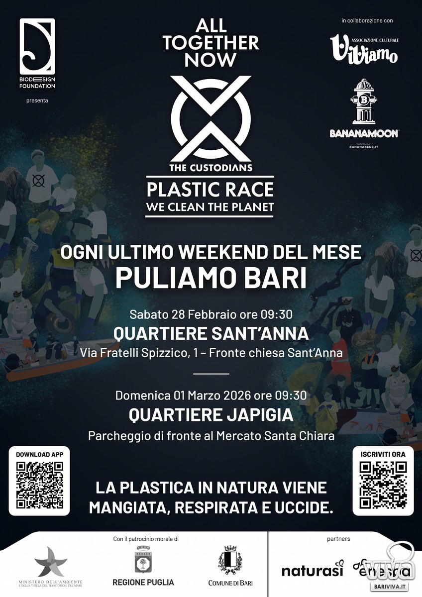 Bari si mobilita per l'ambiente con "The Custodians Plastic Race – We Clean the Planet", l'iniziativa promossa da Biodesign Foundation insieme all'associazione culturale Viviamo e ad altri partner, con il patrocinio di Regione Puglia, Comune di Bari e Ministero dell'Ambiente.