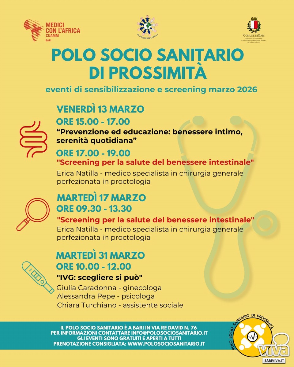 Continuano anche a marzo gli incontri di sensibilizzazione e screening gratuiti negli spazi del Polo Socio Sanitario di Prossimità, in via Re David 76. Gli appuntamenti sono promossi dal Polo e organizzati da Psicologi per i Popoli Bari e Bat e Medici con l'Africa Cuamm Bari, in collaborazione con l'assessorato comunale al Welfare.