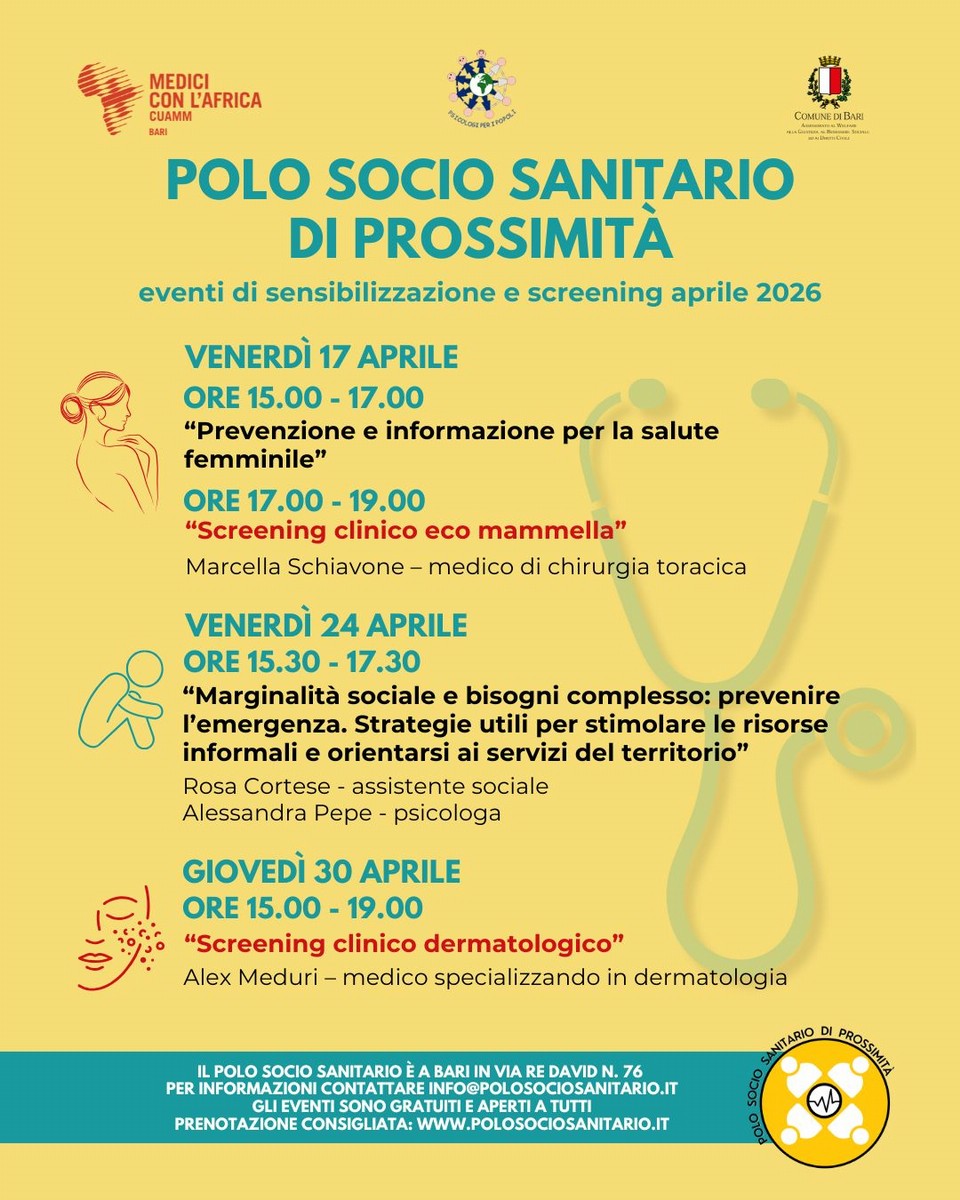 Continuano anche ad aprile gli incontri di sensibilizzazione e screening gratuiti negli spazi del Polo Socio Sanitario di Prossimità, in via Re David 76. Gli appuntamenti sono promossi dal Polo e organizzati da Psicologi per i Popoli Bari e Bat e Medici con l'Africa Cuamm Bari, in collaborazione con l'assessorato comunale al Welfare.