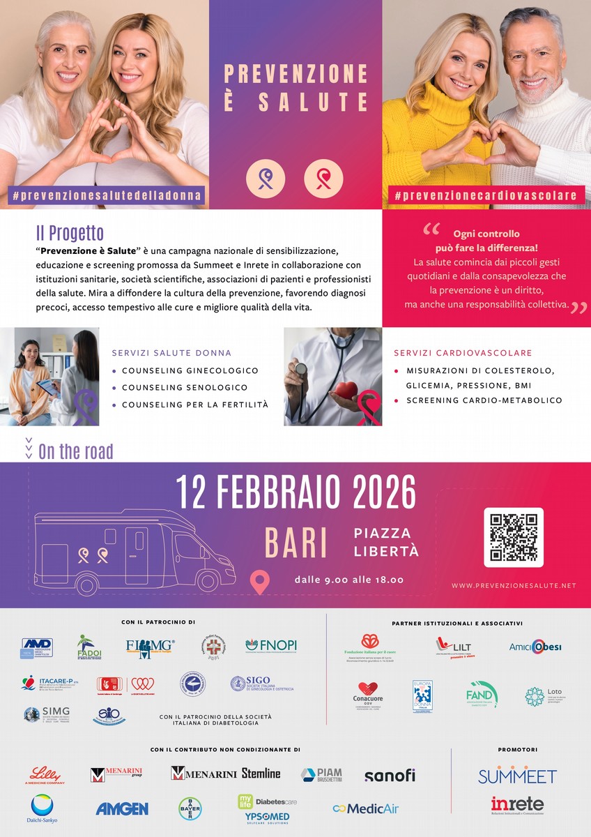 Il 12 febbraio, in Piazza Libertà a Bari, arriverà "Prevenzione è Salute", campagna nazionale dedicata alla prevenzione in ambito cardiovascolare, cardiometabolico e di salute femminile, con screening ed educazione alla salute.