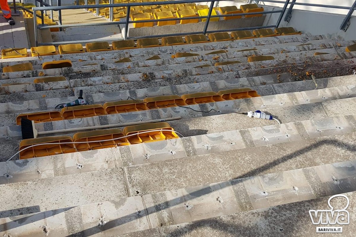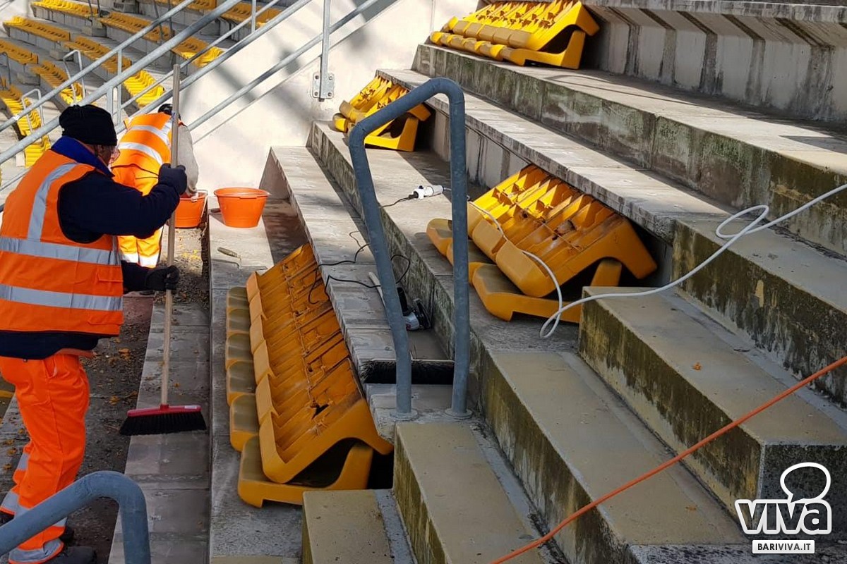 I lavori in tribuna est superiore, che conta 7.660 seggiolini, saranno ultimati in un mese circa, periodo durante il quale la tribuna sarà chiusa al pubblico. A seguire, la ditta incaricata procederà con gli interventi nella tribuna est inferiore (6.363 seggiolini), che si stima dovrà essere chiusa al pubblico fino al 24 marzo, per poi passare alla tribuna ovest superiore (7.188 seggiolini).«Come stabilito dal cronoprogramma - ha commentato l'assessore allo Sport Pietro Petruzzelli - questa mattina la ditta aggiudicataria ha avviato i lavori di rimozione dei vecchi seggiolini. Le operazioni sono partite dalla parte superiore della tribuna est, come concordato con la società del Bari. Nei prossimi giorni gli operai saranno impegnati nello smontaggio delle sedute e nel riempimento dei fori realizzati 30 anni fa in occasione della costruzione dello stadio, ormai inutilizzabili. Pertanto, dopo la rimozione, dovranno sanare eventuali crepe sulla base dei gradoni e riempire i vecchi fori per realizzarne altri su cui posizionare i nuovi seggiolini, intervento che comincerà fra una decina di giorni».