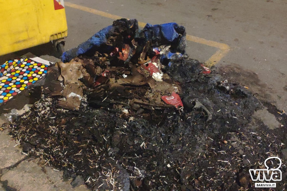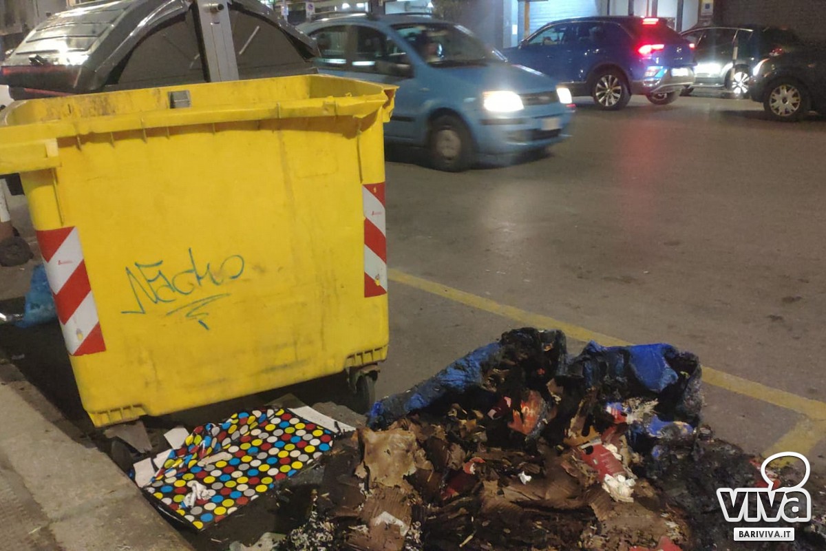 Un cassonetto per la raccolta della carta dato completamente alle fiamme. La scena si è consumata nella notte nel rione Libertà, tra via Brigata Regina e via Nicolai.