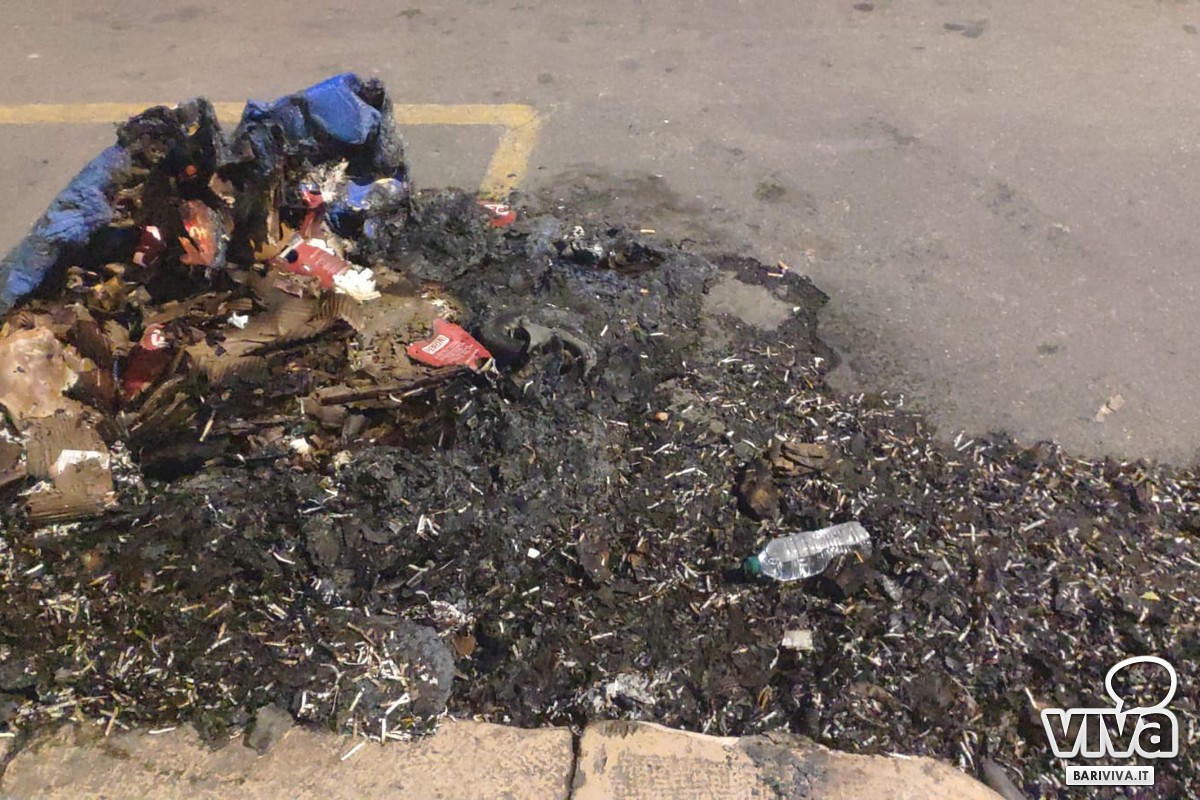 Stamattina gli operatori Amiu hanno parzialmente rimosso lo scheletro del cassonetto incendiato, ma i resti della combustione sono ancora lì, neri e maleodoranti, sul marciapiede.