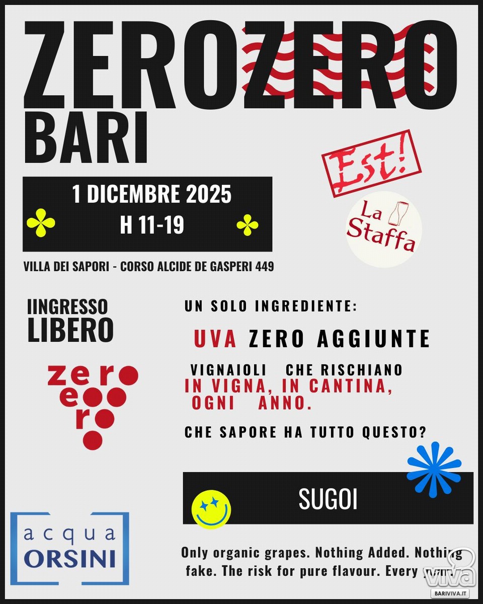 Dopo il successo della prima edizione fiorentina (24 marzo 2025), il salone itinerante del vino artigianale ZeroZero si prepara a illuminare Bari. L'appuntamento è fissato per lunedì 1° dicembre 2025 a Villa dei Sapori, un evento che riunirà produttori italiani e non, accomunati da un'unica, rigorosa filosofia: Zero chimica in vigna e Zero aggiunte in cantina.La Filosofia